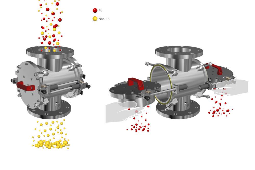 Феромагнитните примеси се улавят от потока от материал върху магнитни дъски разположени във вратите на сепаратора. Вратите са оборудвани с много силни неодимови магнити с магнитна индукция от 7500 G!