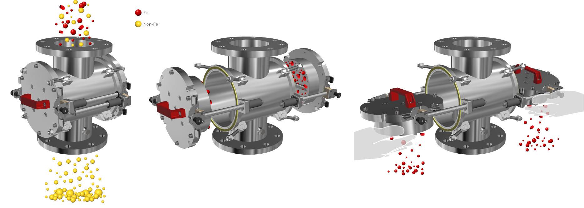 Магнитните врати са закрепени към корпуса на сепаратора чрез насочващи пръти, така че плъзгането им настрани и почистването им е бързо, удобно и безопасно.